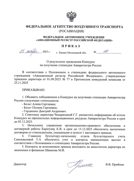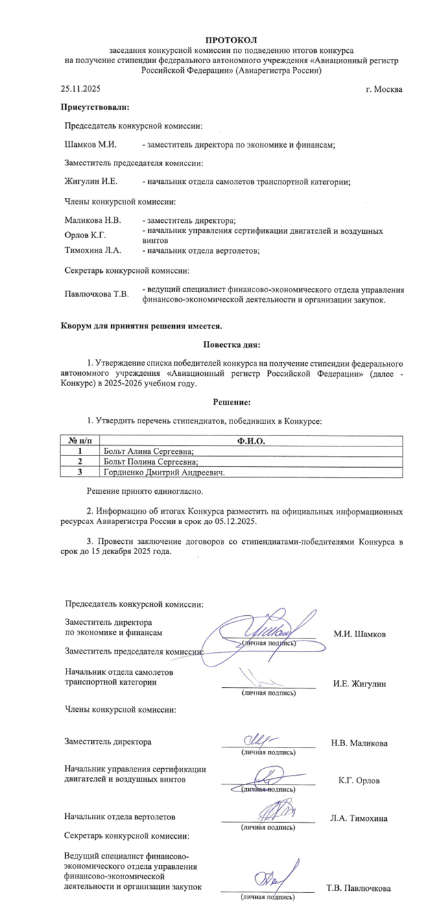 Итоги конкурса отражены в Протоколе заседания конкурсной комиссии и Приказе директора Авиарегистра России.