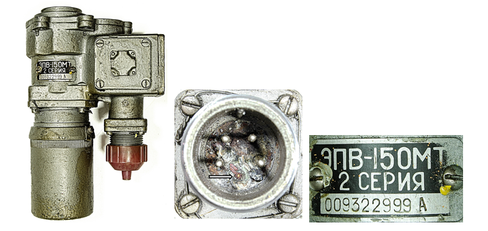 Виды электромеханизма ЭПВ-150МТ сер. 2 № 009322999А, штепсельного разъема и шильдика при поступлении на исследование. Стрелкой показан разрушенный вывод