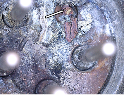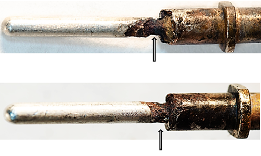 Вид повреждений (показаны стрелками) электроэрозией выводов № 2 и № 1